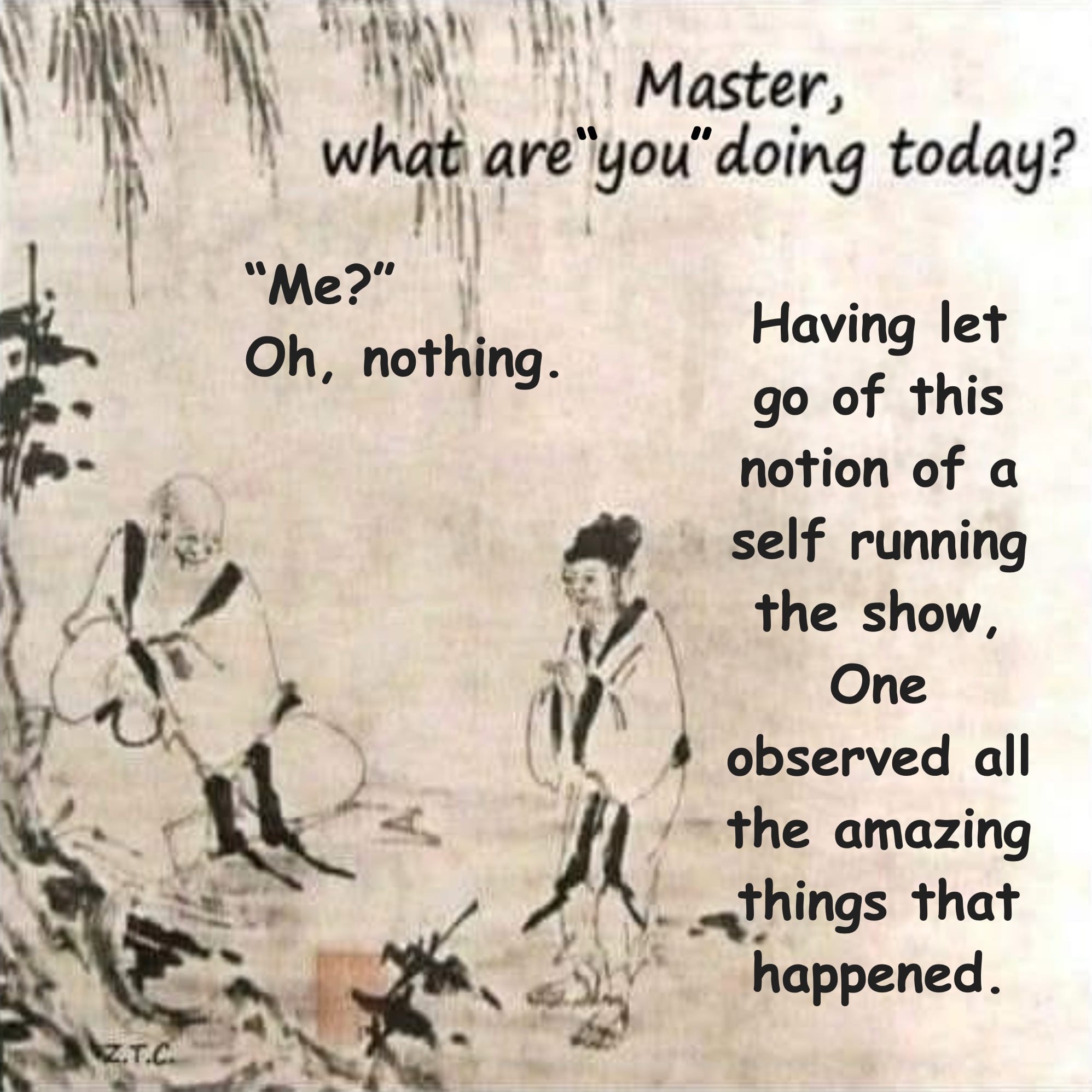 When the Zen Master says he is ādoing nothingā, all he means is that whatever actions heās taking; whatever is being created on his watch⦠āheā (as in: that mind-created sense of self/ego thatās no more than a collection of ideas) is not doing it.